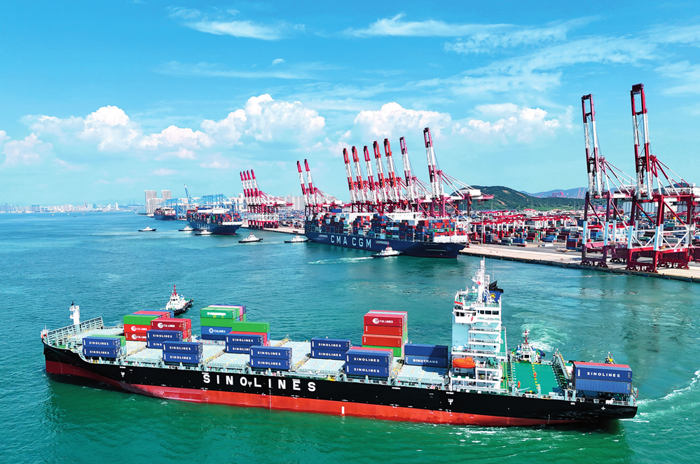 “中外運海口”輪從山東港口青島港出發(fā),駛向印度欽奈港(2023年8月30日攝)。今年以來,山東港口青島港新增 10 條“一帶一路”航線。 張進剛攝 / 本刊