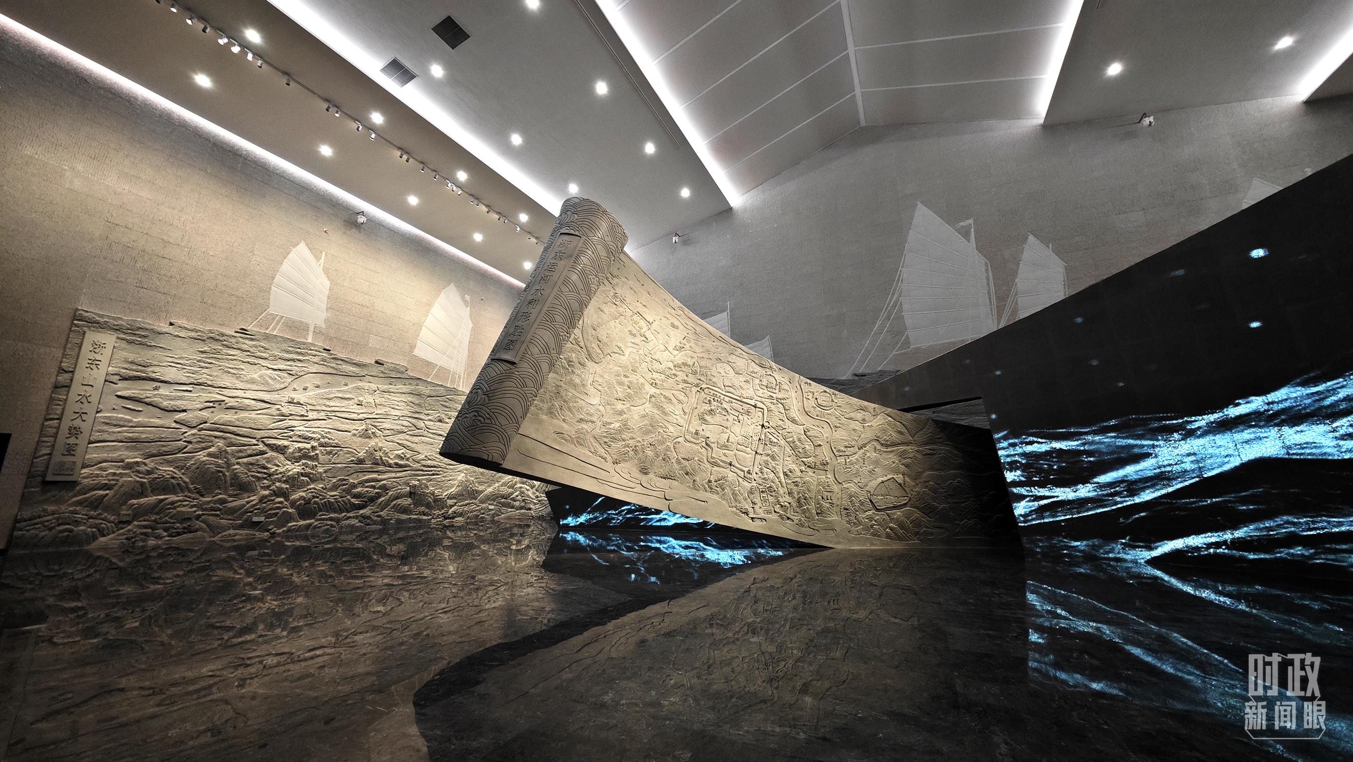 △博物館內(nèi)的《浙東運(yùn)河水利形勝圖》《浙東山水大勢(shì)圖》浮雕。(總臺(tái)央視記者彭漢明拍攝)