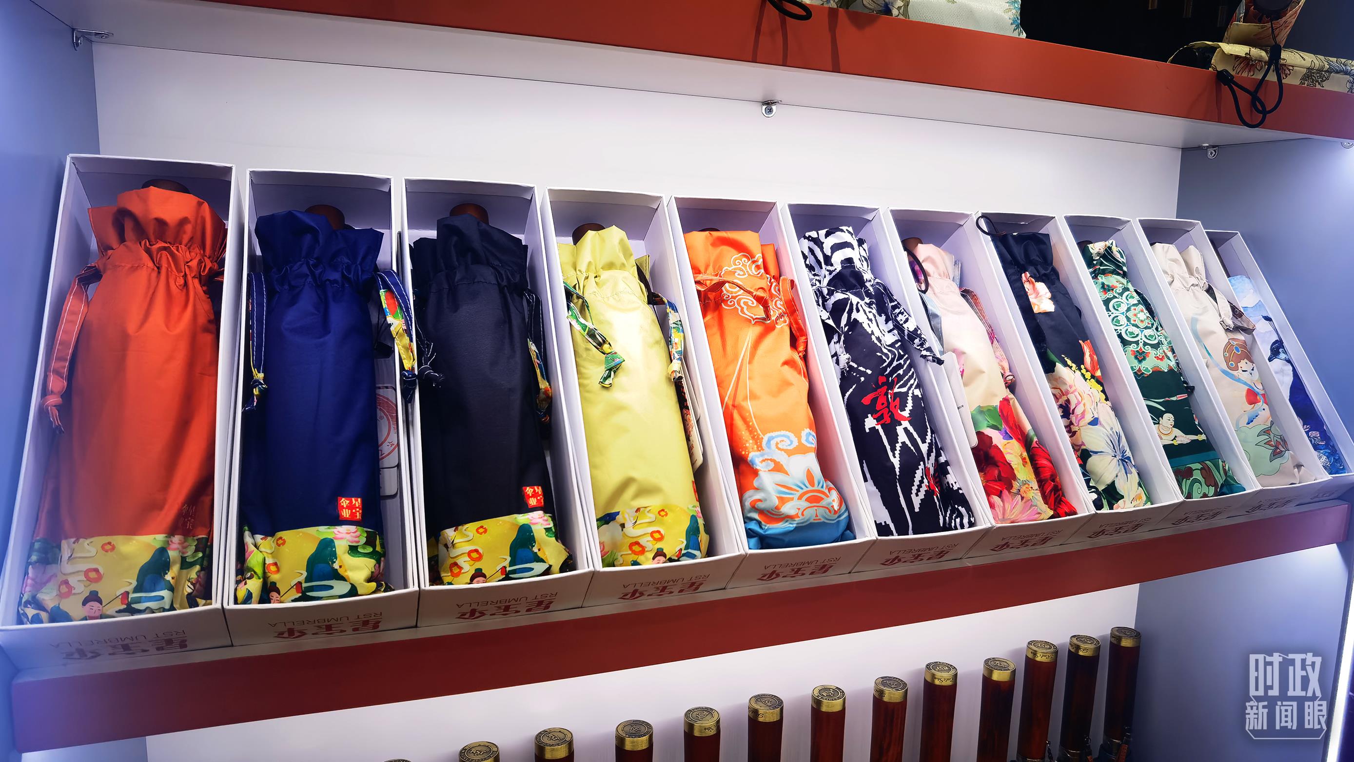 △商貿(mào)城內(nèi)的一家傘鋪,貨架上擺放著包裝精美的雨傘。(總臺(tái)央視記者范學(xué)禹拍攝)