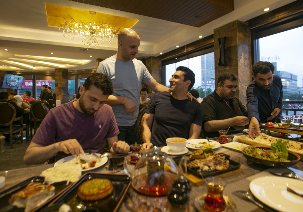 在義烏經(jīng)營餐廳的約旦老板穆罕奈德(左二)與朋友們聊天,他2002年來到義烏創(chuàng)業(yè),并在此安家。