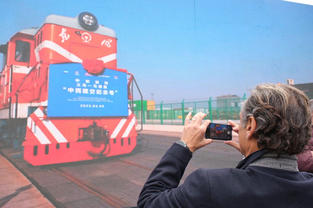 2023年3月9日,一列裝載著小商品、電子產(chǎn)品、日用百貨等貨物的“中西建交紀(jì)念號”中歐班列從浙江義烏鐵路西站奔赴西班牙首都馬德里。一列裝載著紅酒、橄欖油等西班牙特色產(chǎn)品的班列也從馬德里出發(fā),相向而行,駛向義烏。