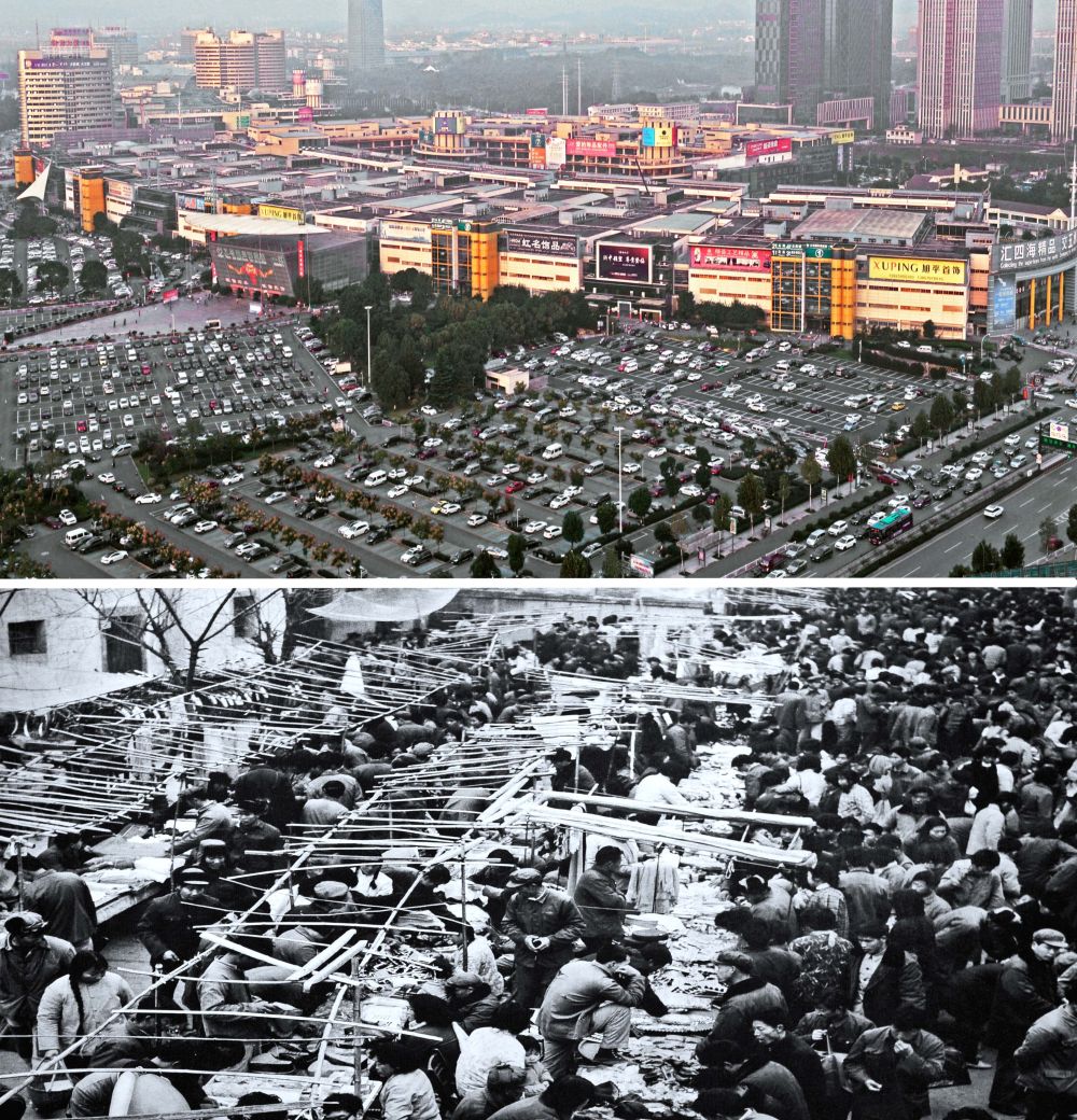 2018年拍攝的義烏國際商貿(mào)城一區(qū)市場(上)和1982年9月開業(yè)的義烏第一代小商品市場(下)。