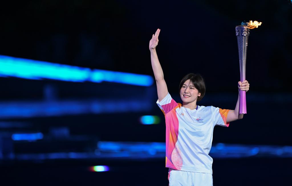 9月23日,火炬手葉詩文在開幕式上進行火炬?zhèn)鬟f。新華社記者 李一博 攝