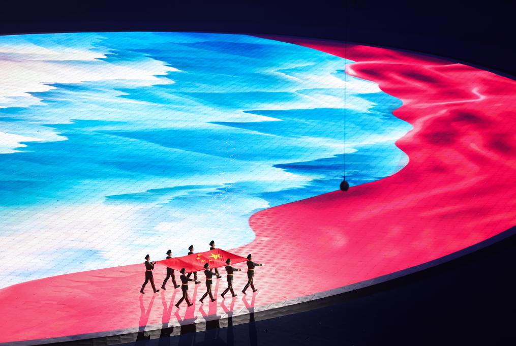 地屏上,一幅紅綢飛掠壯麗河山。8名儀仗兵步伐鏗鏘,護旗入場?!拔覑勰阒袊覑勰愦禾炫畈难砻纭眲尤说馁澑枭钋槌?。