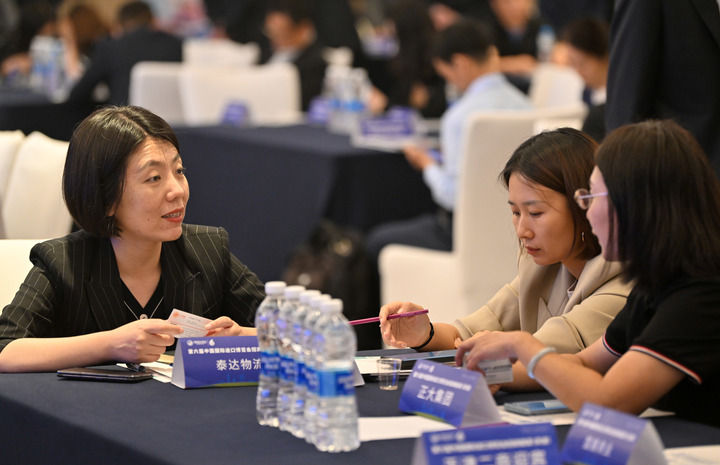 在第六屆中國國際進(jìn)口博覽會(huì)招商路演(天津)活動(dòng)現(xiàn)場,參展商代表和天津的采購商代表進(jìn)行交流(2023年9月26日攝)。新華社記者 李然 攝