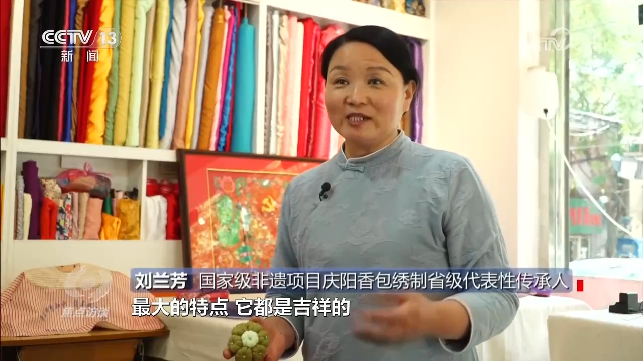 國(guó)家級(jí)非遺項(xiàng)目慶陽香包繡制省級(jí)代表性傳承人劉蘭芳:“這個(gè)針法的特點(diǎn)是一根針一根線從頭到尾不能斷頭,要一次完成,而且左右對(duì)稱、上下對(duì)稱,我們祖祖輩輩傳承到今天?!?/p>