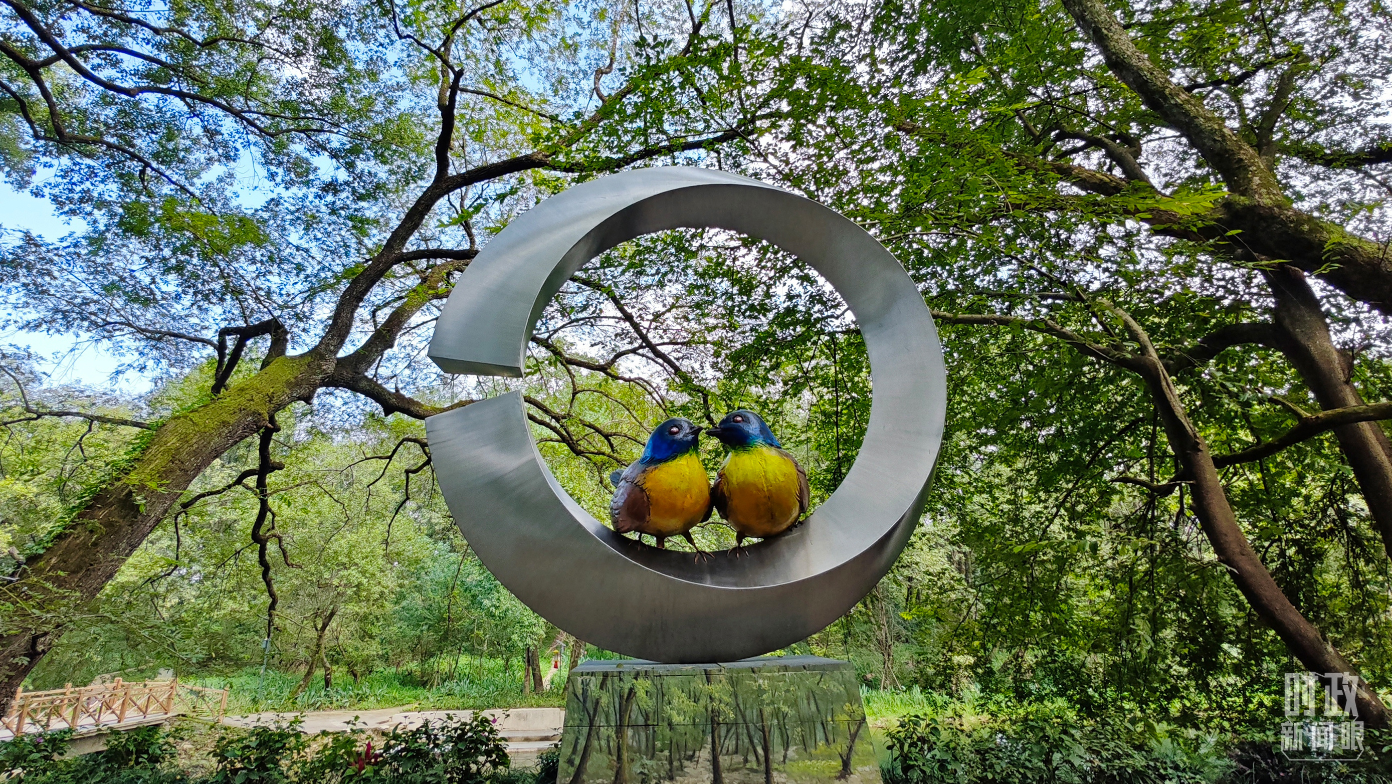 △石門(mén)村里的藍(lán)冠噪鹛雕像。(總臺(tái)央視記者許永松拍攝)