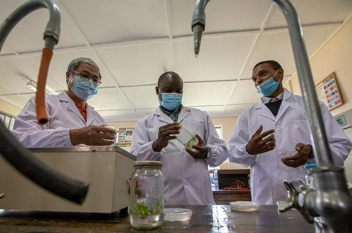 △2021年6月25日,肯尼亞,來自中國(guó)的農(nóng)學(xué)教授與肯尼亞農(nóng)業(yè)專家、肯方研究生在實(shí)驗(yàn)室內(nèi)交流實(shí)驗(yàn)成果。