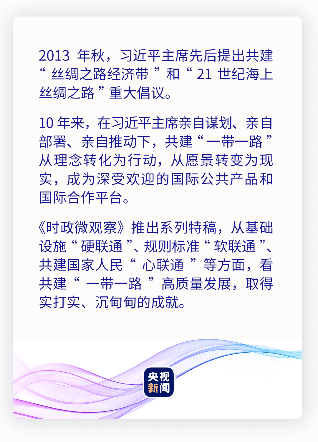 10年來,共建“一帶一路”以高標(biāo)準(zhǔn)、可持續(xù)、惠民生為目標(biāo),以規(guī)則標(biāo)準(zhǔn)“軟聯(lián)通”為重要支撐,為促進(jìn)全球互聯(lián)互通、共同發(fā)展增添新動(dòng)力,推動(dòng)高質(zhì)量共建“一帶一路”不斷走深走實(shí)。