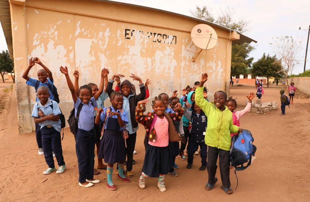 △2023年7月,莫桑比克馬普托省皮科科村學(xué)校的孩子們站在裝有中國援助的衛(wèi)星電視接收天線的房屋前。