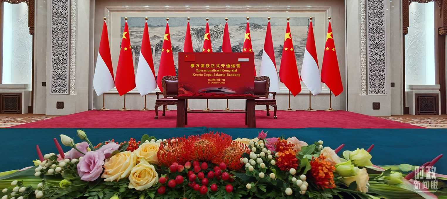 △中國(guó)、印尼兩國(guó)元首當(dāng)天共同為雅萬(wàn)高鐵正式開(kāi)通運(yùn)營(yíng)揭幕,并見(jiàn)證簽署多項(xiàng)雙邊合作文件,這是活動(dòng)開(kāi)始之前的現(xiàn)場(chǎng)。(總臺(tái)央視記者郭鴻拍攝)