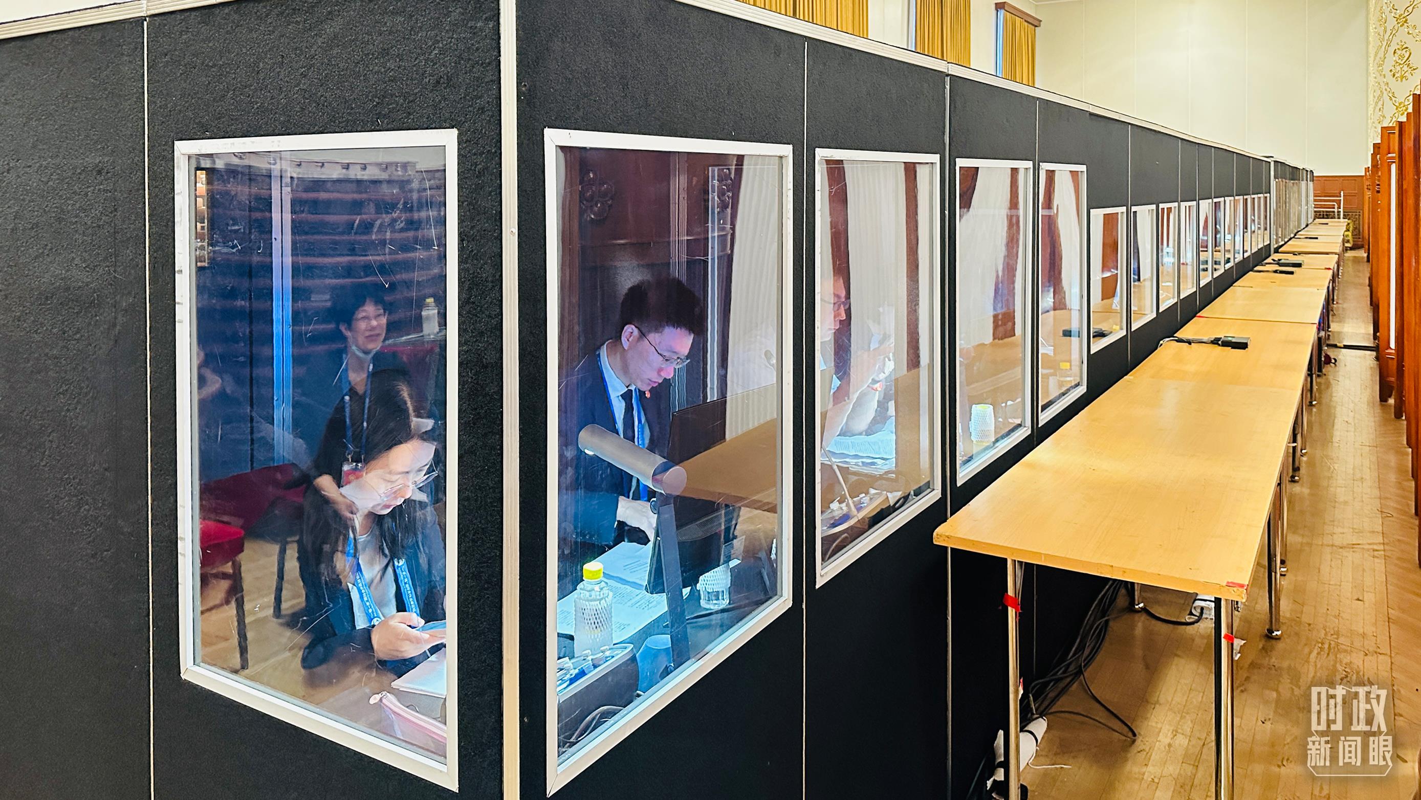 △開幕式現(xiàn)場的多語種同傳間。(總臺國廣記者時冉拍攝)