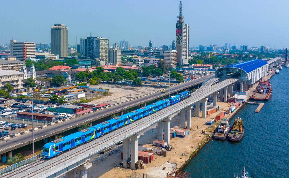 這是尼日利亞拉各斯輕軌藍(lán)線上的一列輕軌列車(2022年12月21日攝,無人機(jī)照片)。新華社發(fā)(托普·阿尤庫攝)