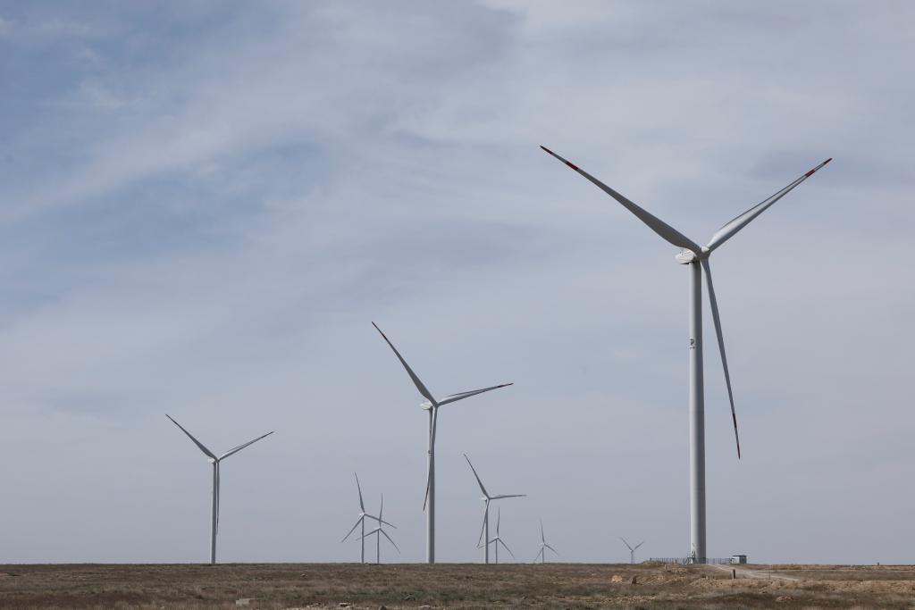 這是4月3日在哈薩克斯坦札納塔斯拍攝的札納塔斯100兆瓦風(fēng)電項(xiàng)目風(fēng)機(jī)。新華社發(fā)(奧斯帕諾夫攝)