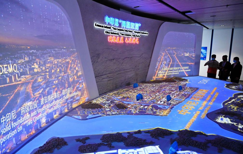 這是2022年11月16日拍攝的福州元洪投資區(qū)元洪食品數(shù)字經(jīng)濟(jì)產(chǎn)業(yè)中心的中印尼“兩國(guó)雙園”沙盤和項(xiàng)目介紹。中印尼“兩國(guó)雙園”是以福建福州元洪投資區(qū)和印尼的民丹工業(yè)園等園區(qū)為載體,探索建立產(chǎn)業(yè)互聯(lián)、設(shè)施互通、政策互惠的雙園結(jié)對(duì)合作機(jī)制。新華社記者林善傳攝