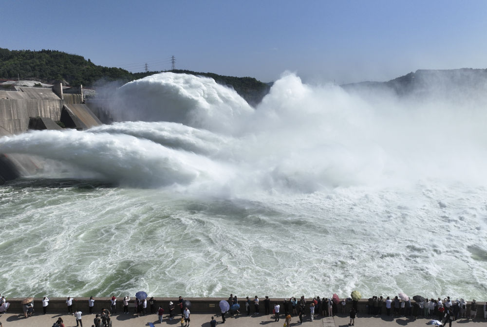 游客在黃河小浪底水利樞紐工程出水口觀看調(diào)水調(diào)沙(2023年6月23日攝,無(wú)人機(jī)照片)。新華社發(fā)(苗秋鬧 攝)