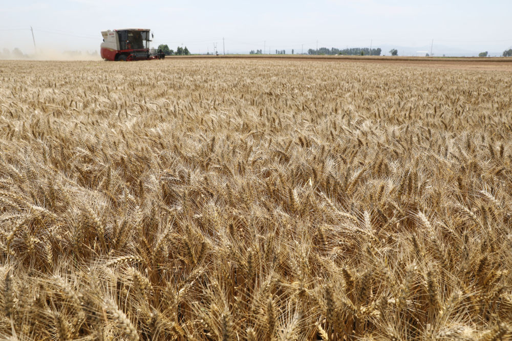 河南省焦作市溫縣黃河街道張王莊村村民駕駛收割機(jī)在田間收獲小麥(2023年6月6日攝)。新華社發(fā)(徐宏星 攝)