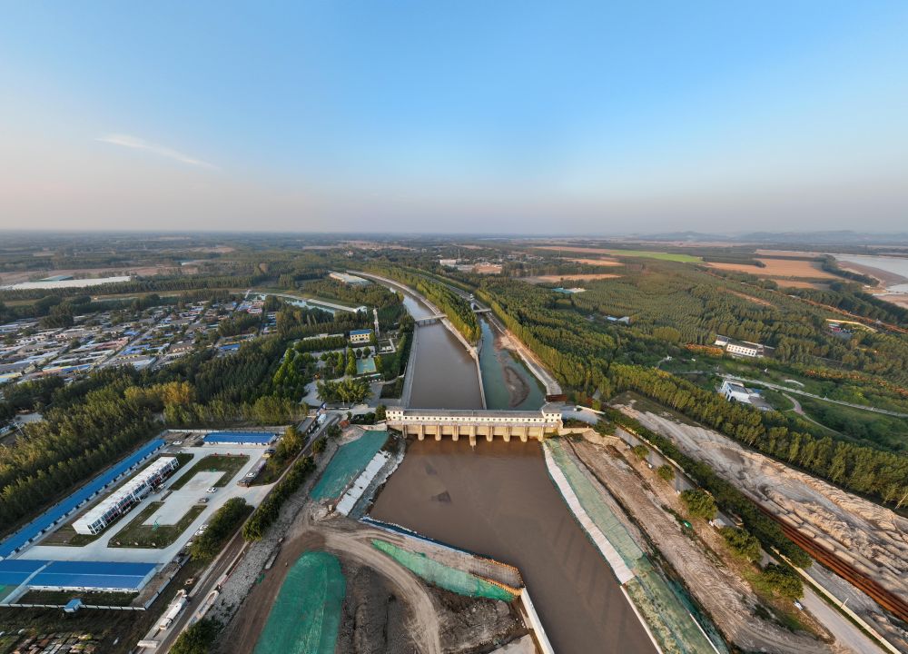 山東聊城位山灌區(qū)的黃河位山閘和引水渠(2023年10月10日攝,無(wú)人機(jī)照片)。新華社記者 邢廣利 攝