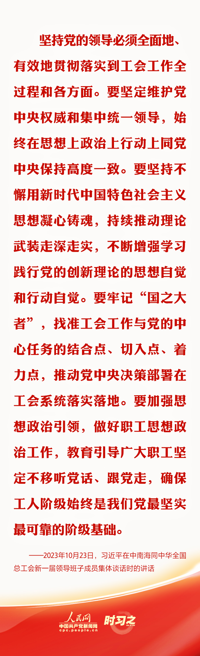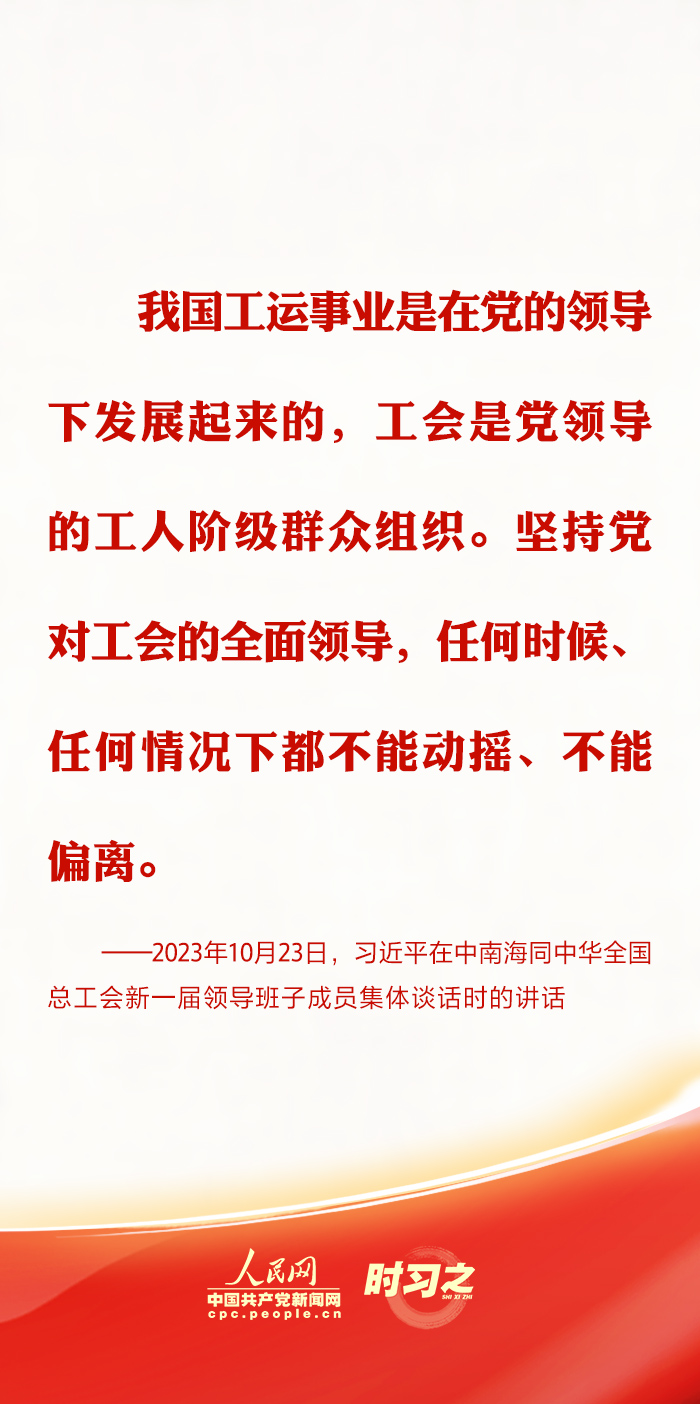 中共中央總書記、國家主席、中央軍委主席習近平10月23日下午在中南海同中華全國總工會新一屆領導班子成員集體談話并發(fā)表重要講話?!皥猿贮h對工會的全面領導,任何時候、任何情況下都不能動搖、不能偏離。”習近平總書記在多個場合強調加強思想政治引領的重要性,指引新時代工會工作蓬勃發(fā)展。