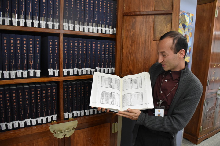 4月20日,一名圖書管理員在美國洛杉磯公共圖書館的中央圖書館展示《廣州大典》。