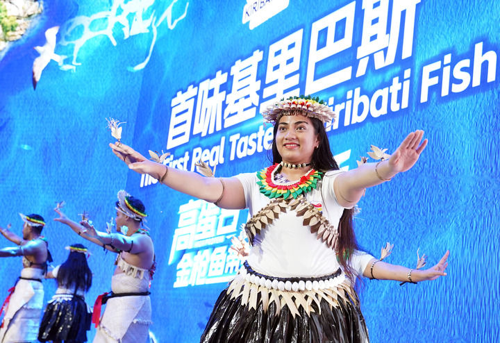 11月8日,來自基里巴斯的參展人員在基里巴斯水產品推介活動上表演。