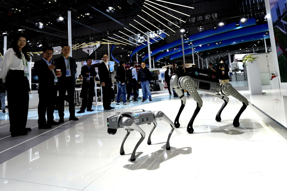 11月7日,在第六屆進博會技術裝備展區(qū),觀眾在觀看??怂箍嫡故镜闹悄軝C器狗。