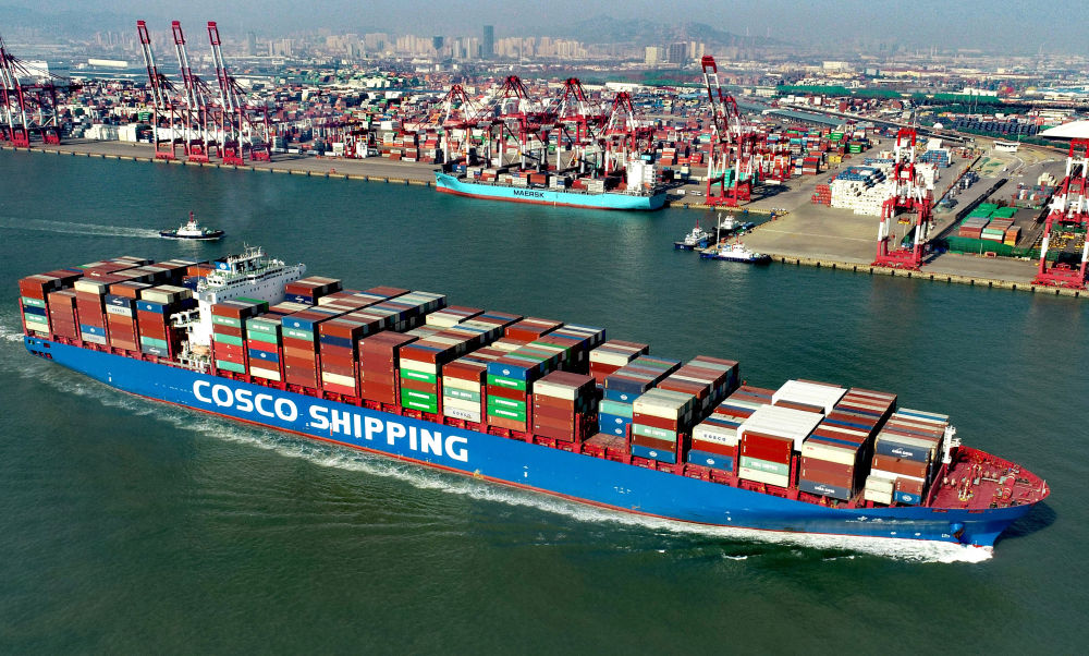 2021年2月19日,在位于山東自貿試驗區(qū)青島片區(qū)的山東港口青島港前灣集裝箱碼頭,一艘滿載集裝箱的貨輪駛出港口。
