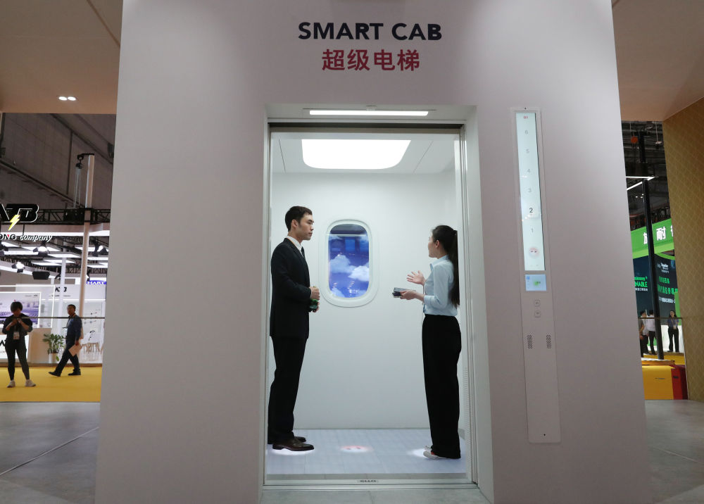 11月5日,工作人員(右)在第六屆進博會上向參觀者介紹奧的斯公司全新推出的超級電梯。