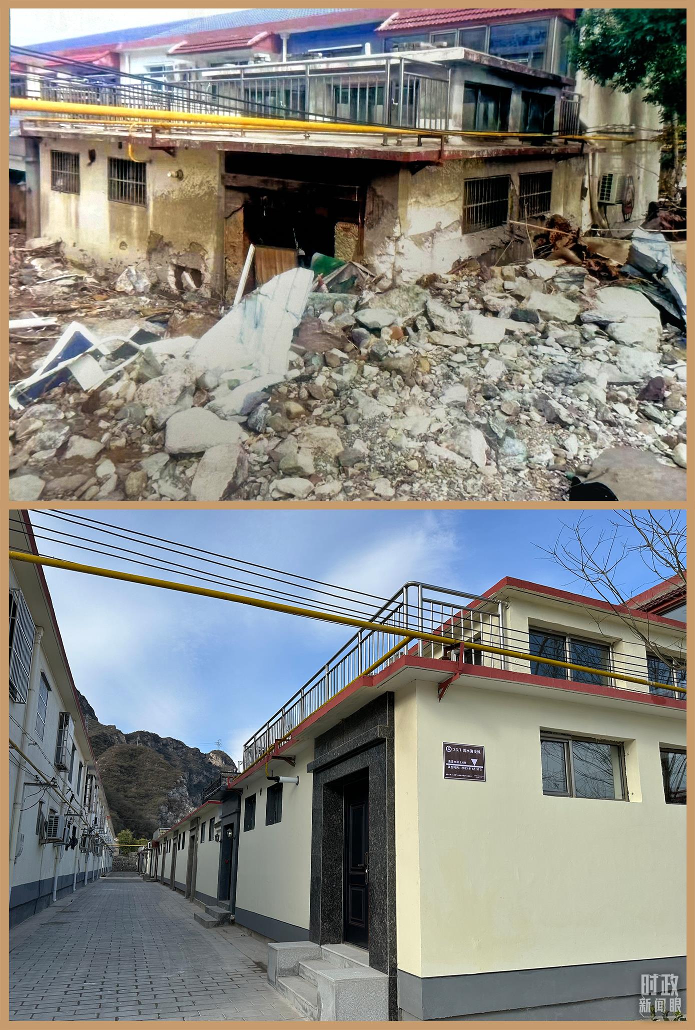 △ 村民房屋遭遇洪災與災后重建的對比圖。(總臺央視記者范一鳴拍攝)