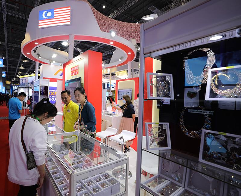 △2023年11月6日,參觀者在第六屆進(jìn)博會(huì)國(guó)家展馬來(lái)西亞展臺(tái)欣賞展出的珠寶首飾。