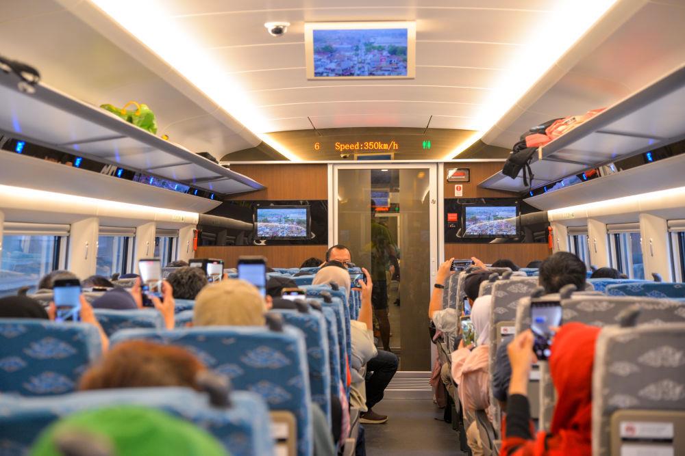 △2023年11月5日,在行駛中的雅萬(wàn)高鐵高速動(dòng)車(chē)組列車(chē)車(chē)廂內(nèi),乘客紛紛用手機(jī)拍攝顯示列車(chē)時(shí)速達(dá)到350公里的電子屏。