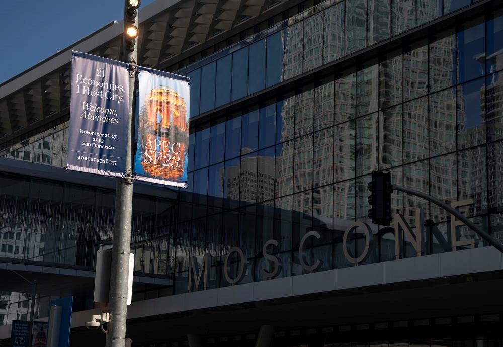 △近日,美國(guó)舊金山亞太經(jīng)合組織會(huì)議場(chǎng)地外的宣傳海報(bào)。