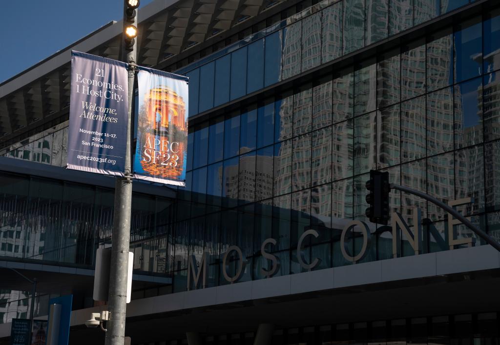 舊金山的亞太經(jīng)合組織會(huì)議場(chǎng)地外的宣傳海報(bào)。
