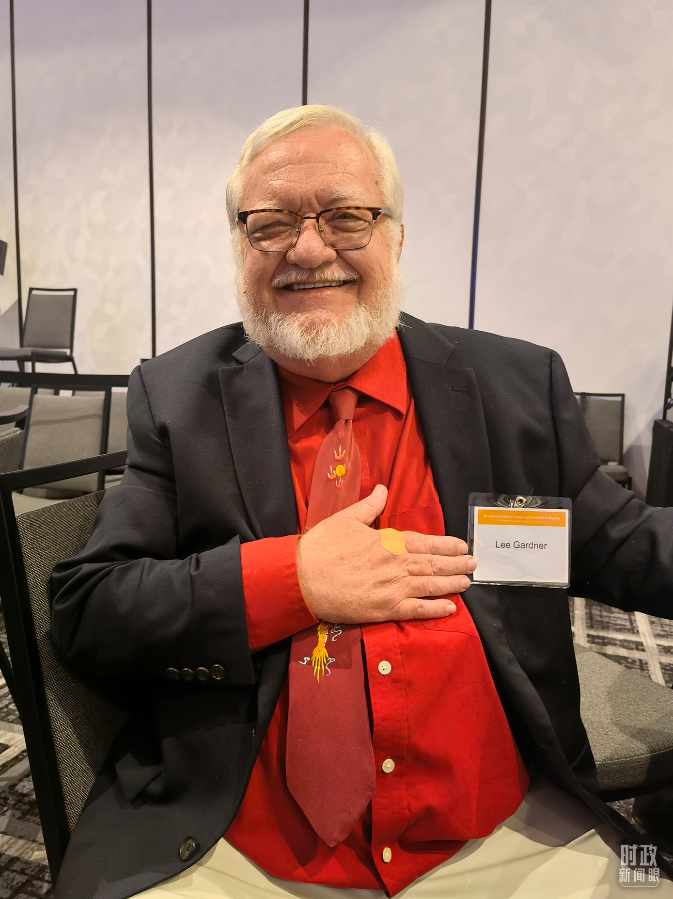 △年逾70歲的李·加德納,是“鼓嶺故事”主人公密爾頓·加德納的侄孫。當(dāng)天他特意佩戴了一條繡有“中國(guó)龍”的領(lǐng)帶。(總臺(tái)央視記者石丞、國(guó)廣記者李晉拍攝)
