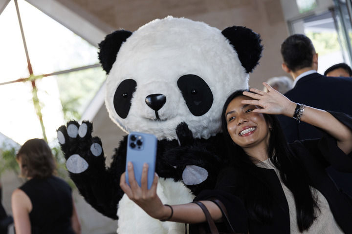 2022年8月24日,在美國華盛頓中國駐美國大使館,來賓與大熊貓玩偶合影。