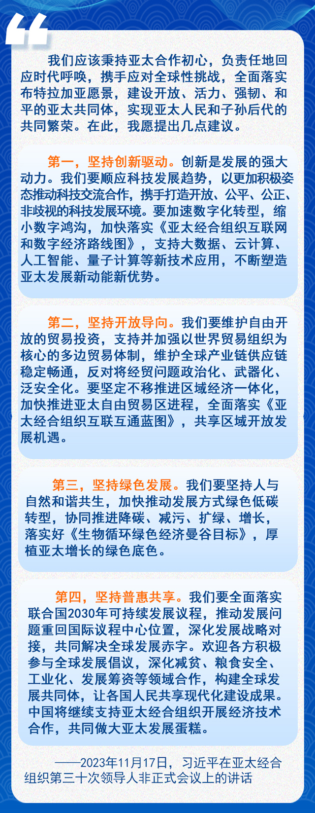 當(dāng)?shù)貢r(shí)間11月17日上午,亞太經(jīng)合組織第三十次領(lǐng)導(dǎo)人非正式會(huì)議在美國(guó)舊金山舉行。中國(guó)國(guó)家主席習(xí)近平出席會(huì)議并發(fā)表重要講話,提出亞太地區(qū)要“堅(jiān)持創(chuàng)新驅(qū)動(dòng)、堅(jiān)持開放導(dǎo)向、堅(jiān)持綠色發(fā)展、堅(jiān)持普惠共享”四點(diǎn)建議,攜手應(yīng)對(duì)全球性挑戰(zhàn),共同打造亞太下一個(gè)“黃金三十年”。