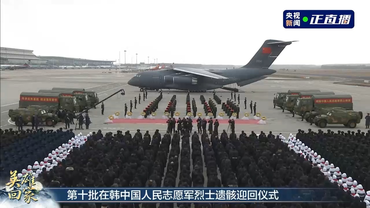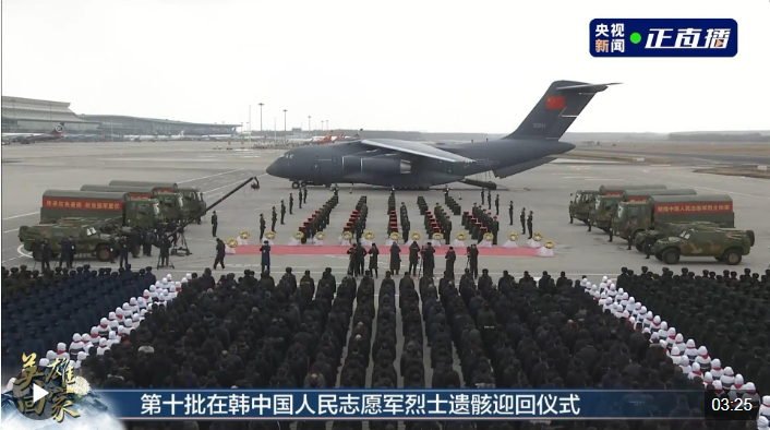 記者從退役軍人事務部了解到,今天(11月23日)上午,第十批25位在韓中國人民志愿軍烈士遺骸及遺物由空軍專機護送從韓國接回遼寧沈陽。