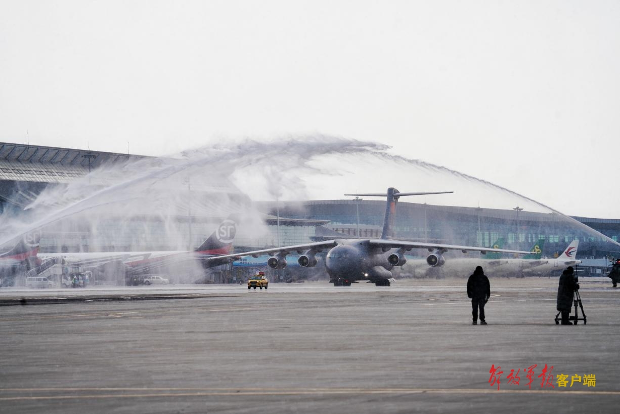 滑行時(shí),兩道水柱從跑道兩側(cè)的消防車中噴射而出,它們在拋物線最高點(diǎn)相遇,一道“水門”傾瀉而下,為搭載志愿軍烈士遺骸的運(yùn)-20專機(jī)接風(fēng)洗塵。