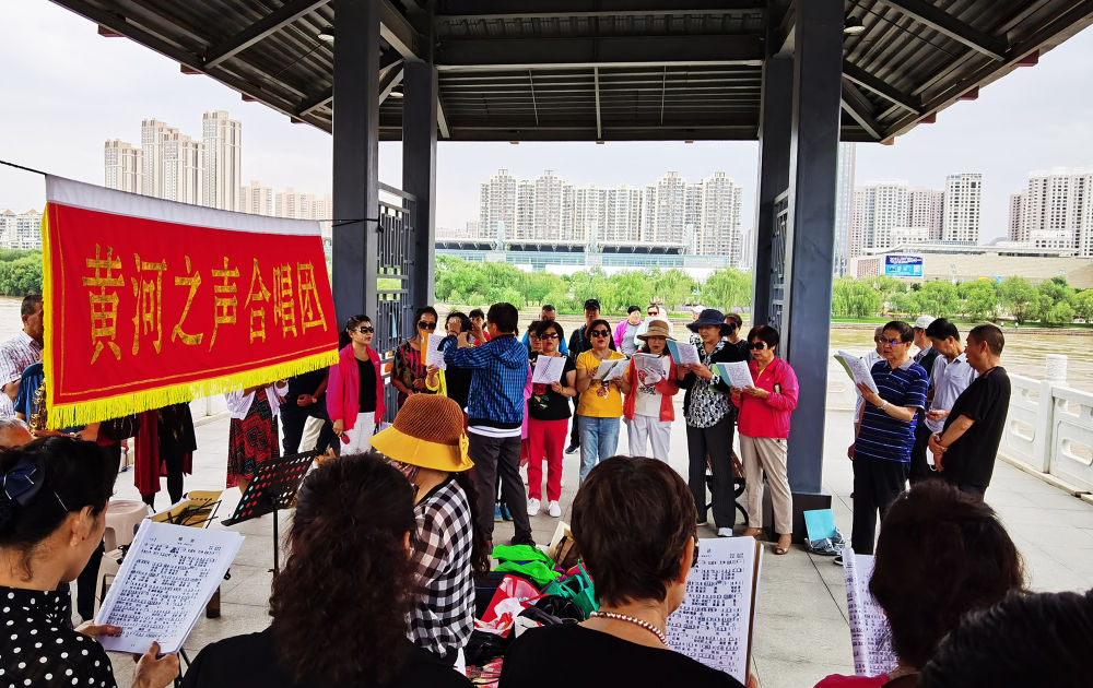 在蘭州市城關區(qū)黃河治理蘭鐵泵站項目點,黃河之聲合唱團開展合唱活動(2020年6月15日攝)。