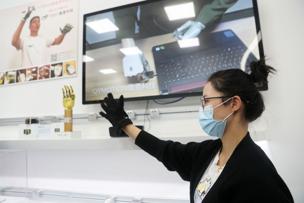 在上海張江人工智能島內(nèi),工作人員在展示“智能神經(jīng)仿生手”(2020年11月3日攝)。