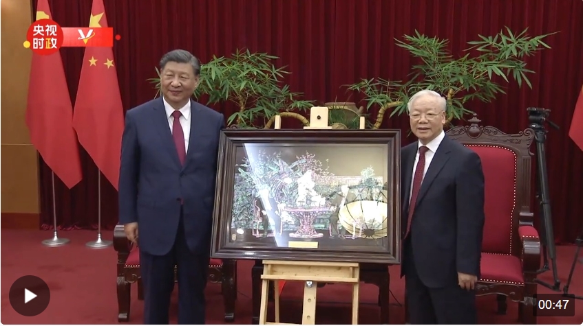 茶敘現(xiàn)場,阮富仲向習(xí)近平贈(zèng)送一幅圖片。阮富仲說:“東西可能不是非常好,但是珍貴的是兄弟情誼?!?/p>