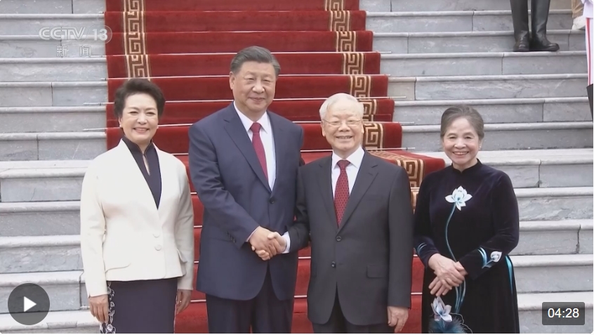 當(dāng)晚,越共中央總書記阮富仲夫婦、越南國家主席武文賞夫婦共同為習(xí)近平和彭麗媛舉行盛大歡迎宴會。越共中央政治局委員、書記處書記等高層領(lǐng)導(dǎo)人全部陪同出席。
