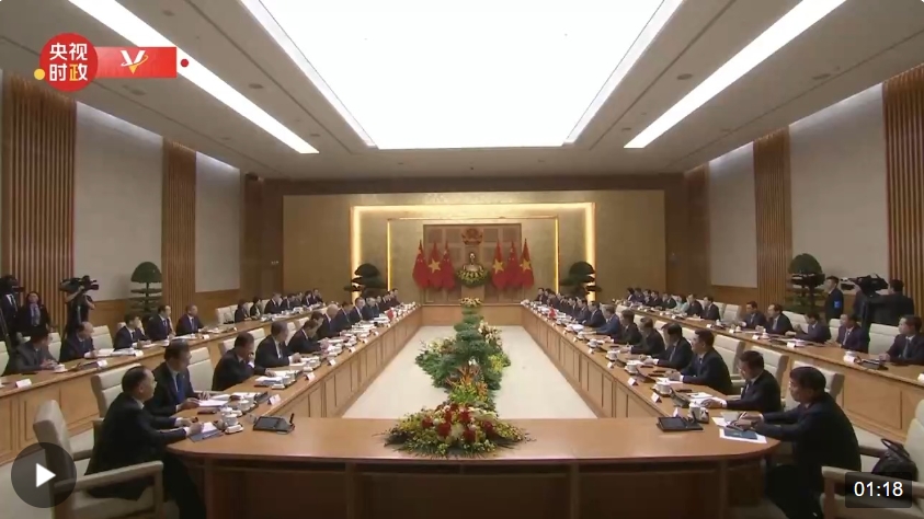 當前,中越關(guān)系持續(xù)向好發(fā)展。昨天,我同阮富仲總書記一道見證雙方簽署的合作文件,涵蓋了兩黨兩國合作的方方面面,充分說明中越關(guān)系的廣度和深度非同一般。我同阮富仲總書記一道宣布構(gòu)建具有戰(zhàn)略意義的中越命運共同體,開啟了新時代中越關(guān)系新篇章,相信將為兩國人民帶來更大福祉,為地區(qū)和世界和平、穩(wěn)定、發(fā)展作出積極貢獻。