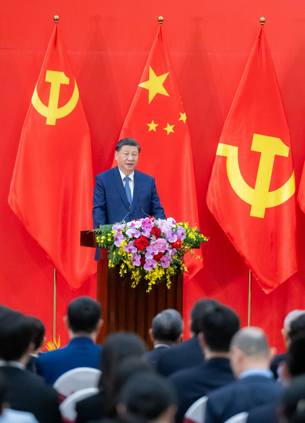 當?shù)貢r間12月13日下午,中共中央總書記、國家主席習近平和夫人彭麗媛在河內(nèi)同越共中央總書記阮富仲夫婦共同會見中越兩國青年和友好人士代表。這是習近平發(fā)表題為《賡續(xù)傳統(tǒng)友誼,開創(chuàng)中越命運共同體建設新征程》的重要講話。新華社記者 申宏 攝