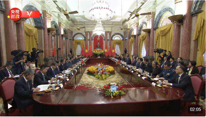 習(xí)近平指出,這是我擔(dān)任中共中央總書記、國家主席以來第三次對越南進(jìn)行國事訪問,是對去年10月阮富仲總書記訪華的回訪,也是今年我對外訪問的收官之旅,充分表明中越關(guān)系在中國外交布局特別是周邊外交中的特殊地位。昨天,我同阮富仲總書記進(jìn)行了長時(shí)間深入交流,一道宣布構(gòu)建具有戰(zhàn)略意義的中越命運(yùn)共同體,攜手開辟了兩黨兩國關(guān)系發(fā)展新階段。站在新的歷史起點(diǎn)上,中方愿同越方一道,深化戰(zhàn)略溝通,推動具有戰(zhàn)略意義的中越命運(yùn)共同體落地生根、開花結(jié)果,造福兩國人民。