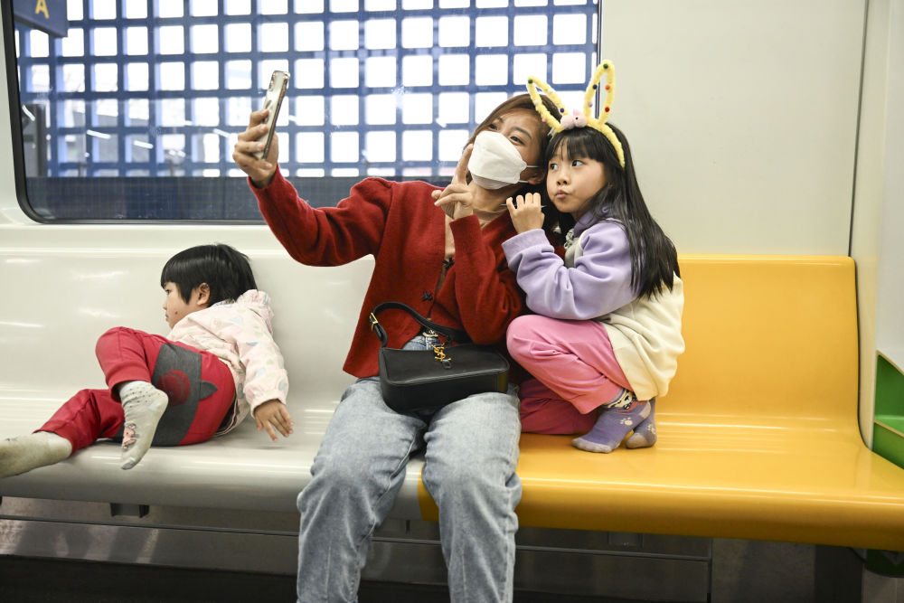 2023年12月9日,市民在越南河內(nèi)吉靈-河東線輕軌車廂里自拍。新華社記者程一恒攝