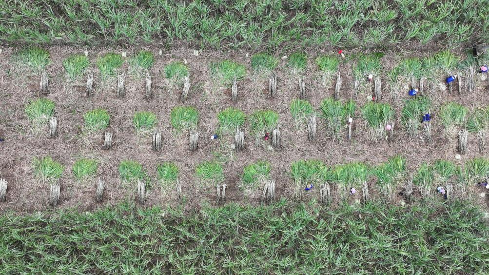 近日,無人機拍攝的廣西來賓市興賓區(qū)蔗農正在砍收甘蔗。 新華社記者 周華 攝