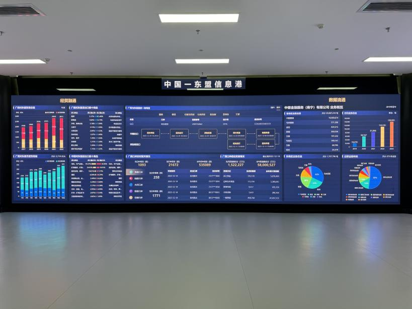 在中國—東盟信息港數(shù)字經(jīng)濟(jì)展示中心,3米高的電子顯示屏上,邊民互市貿(mào)易的數(shù)字在不斷跳動。這個集交易、通關(guān)、金融和物流為一體的中國—東盟“商貿(mào)通”數(shù)字化平臺,可以為客戶提供跨境貿(mào)易全鏈條、數(shù)字化、一站式綜合服務(wù),實(shí)現(xiàn)邊民互市當(dāng)天交易、當(dāng)天通關(guān)。