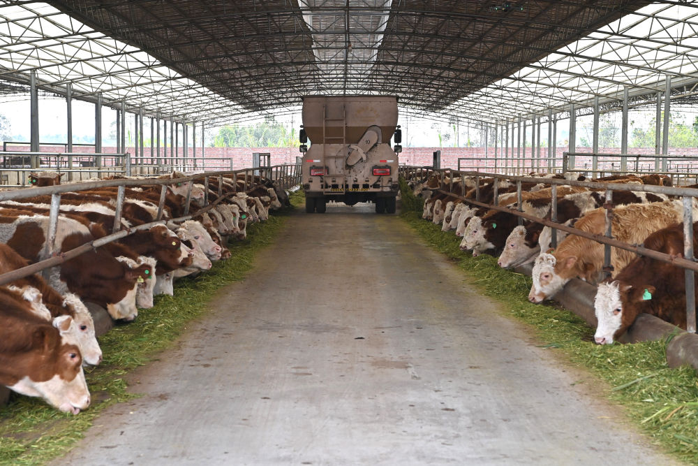 12月13日,在來(lái)賓市興賓區(qū)大灣鎮(zhèn)雙誠(chéng)牧業(yè)有限公司,工人駕駛車(chē)輛給牛投撒以甘蔗尾葉為主要原料的飼料。