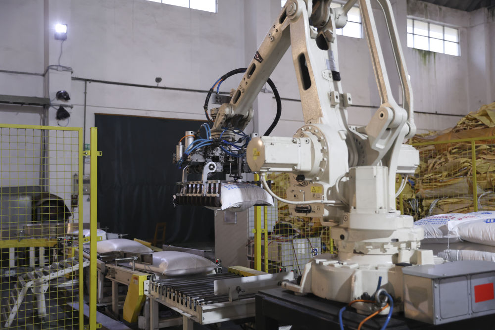 12月14日,在廣西來(lái)賓東糖鳳凰有限公司,機(jī)械臂在廠(chǎng)房碼放白砂糖成品。